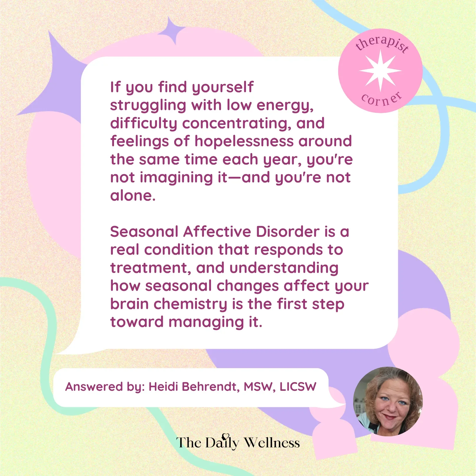 Heidi Behrendt, MSW, LICSW, was recently featured in The Daily Wellness’ “The Therapist’s Corner,” sharing insights on Seasonal Affective Disorder (SAD) and how awareness and prevention can make all the difference during seasonal changes.